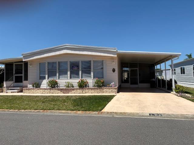This large 24 X 44 home has alot to offer for the price. The large rooms and design setup make the spaces very versatile. The streamline lines outside give you possible planting ideas to add color and the covered carport leads into a screened-in lanai. In the back of the home there is a shed for all your storage needs. The side entrance brings you into the L-shaped kitchen where there is updated counters and cabinets in your all white kitchen. The washer and dryer are also located inside behind folding doors. The dining room and living area are drenched with sun-filled windows across the front and there is room for a larger table if desired and a built-in hutch for storage.